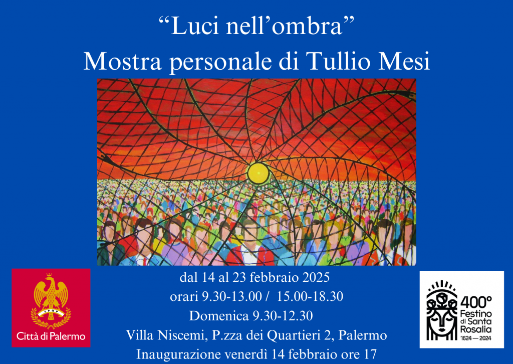 Il 14 febbraio alle ore 17 nello spazio espositivo “Nicola Scafidi” di Villa Niscemi, sarà inaugurata la mostra personale del pittore Tullio Mesi dal titolo “Luci nell'ombra”.