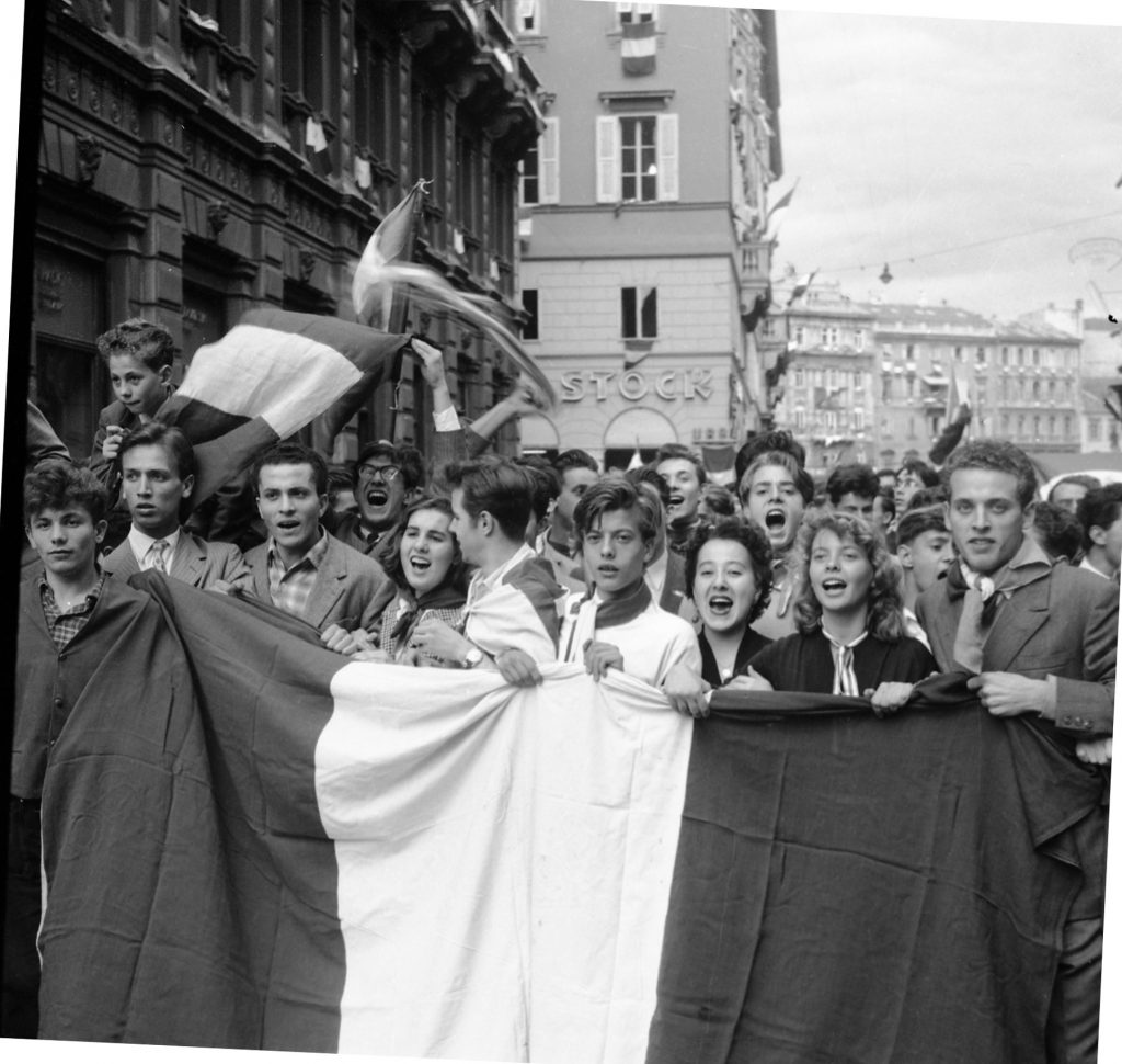 L’esposizione in Sala Selva presenta circa trecento fotografie conservate dalla Fototeca, arricchite da alcuni oggetti iconici tra cui la FIAT Topolino, la Lambretta, la radio Geloso, il vinile originale di Vola Colomba, giocattoli, macchine fotografiche, documenti e riviste d’epoca. Un’accurata ricognizione dei fondi dei fotografi Ugo Borsatti, Adriano de Rota, Livio Amstici, Gianni Anzalone, dell’agenzia fotografica Giornalfoto, dell’archivio fotografico comunale e dell’archivio donato dalla famiglia del Sindaco Gianni Bartoli, tutti conservati in Fototeca, incrociata con l’analisi di altre fonti documentali e bibliografiche coeve, consente una sorta di rendicontazione che mira a illustrare i grandi e piccoli eventi occorsi.