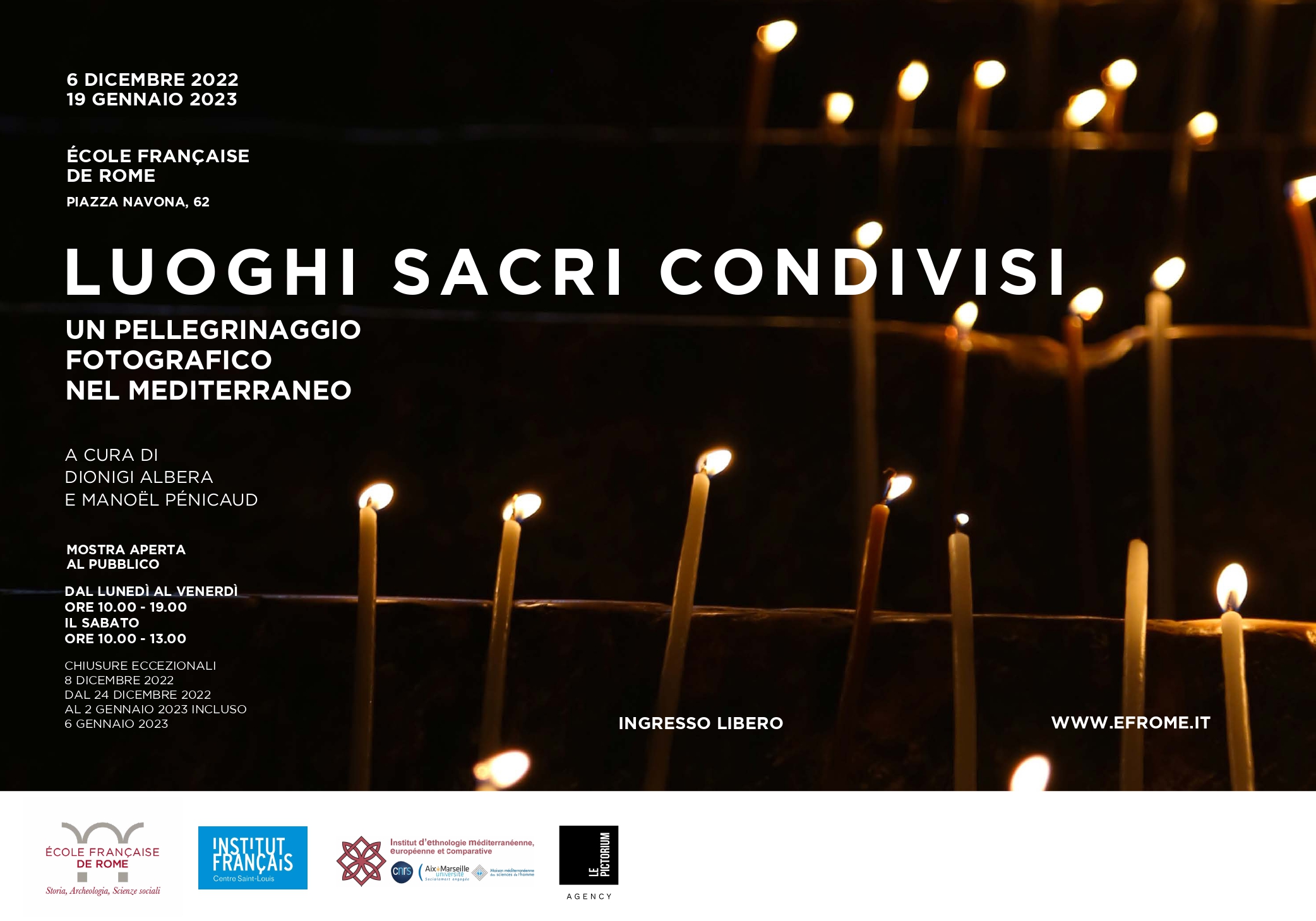 Apre al pubblico il 6 dicembre la mostra fotografica "Luoghi Sacri Condivisi" Un pellegrinaggio fotografico nel Mediterraneo- all'interno degli spazi espositivi dell'École française de Rome nella sede di Piazza Navona, 62 e sarà visitabile fino al 19 gennaio 2023.