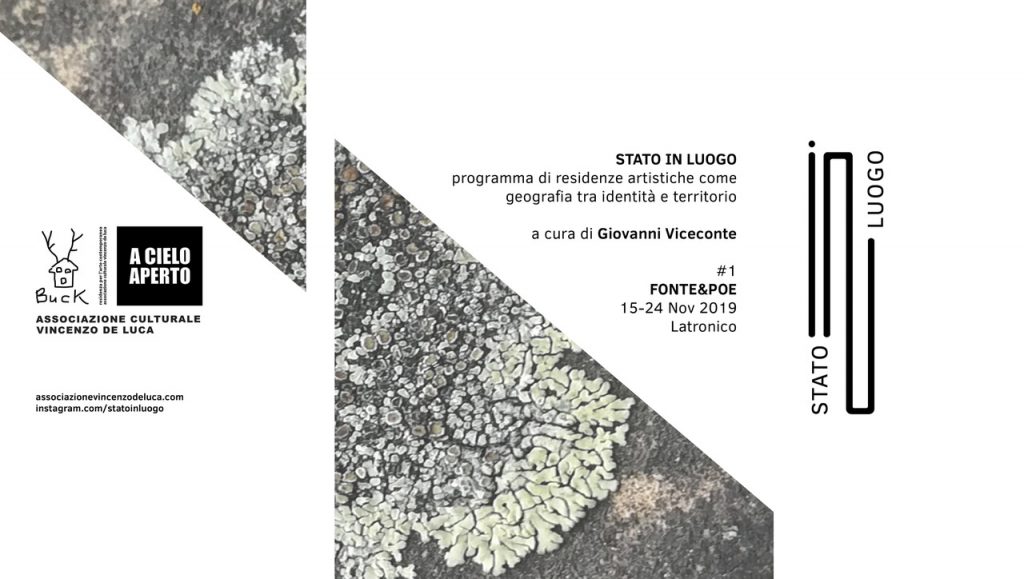 Nell’ambito del progetto A Cielo Aperto, sostenuto dall’Associazione culturale Vincenzo De Luca, curato dal 2007 da Bianco-Valente e Pasquale Campanella, dal prossimo 15 novembre 2019 viene proposto il nuovo programma di residenze artistiche dal titolo STATO IN LUOGO, a cura di Giovanni Viceconte.