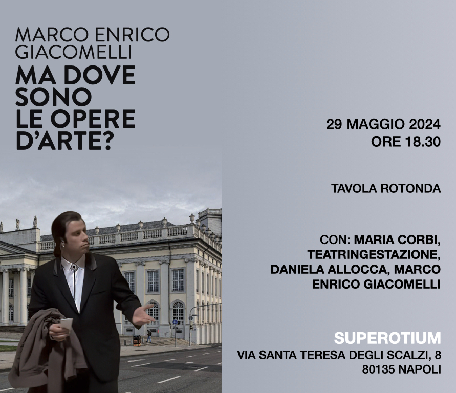 Il 29 maggio 2024, alle ore 18.30, partendo dal testo di Marco Enrico Giacomelli “Ma dove sono le opere d’arte?, Un glossario i/e-spirato dalla documenta 15”, saranno coinvolti lo stesso Giacomelli ed altri artisti, critici, curatori e thinker locali in un dialogo su come cambiano le opere d’arte rispetto al coinvolgimento e al ruolo di nuovi pubblici e il rapporto fra arte e politica.