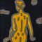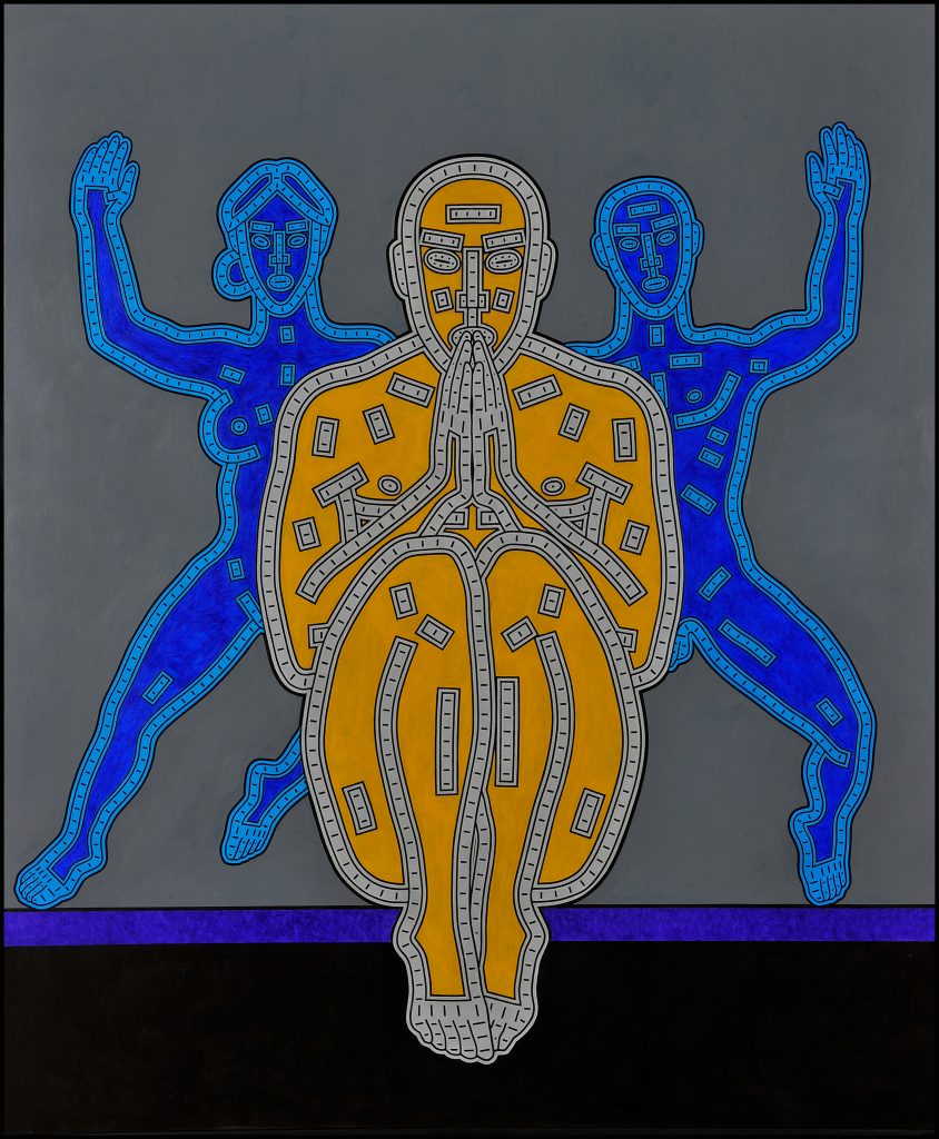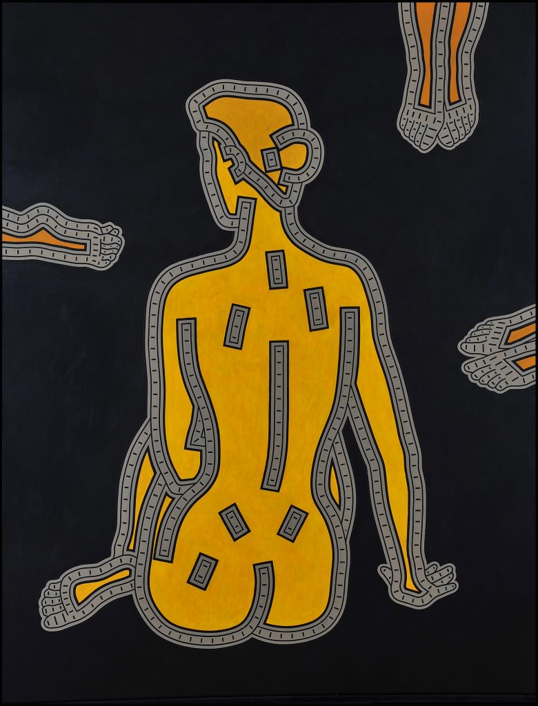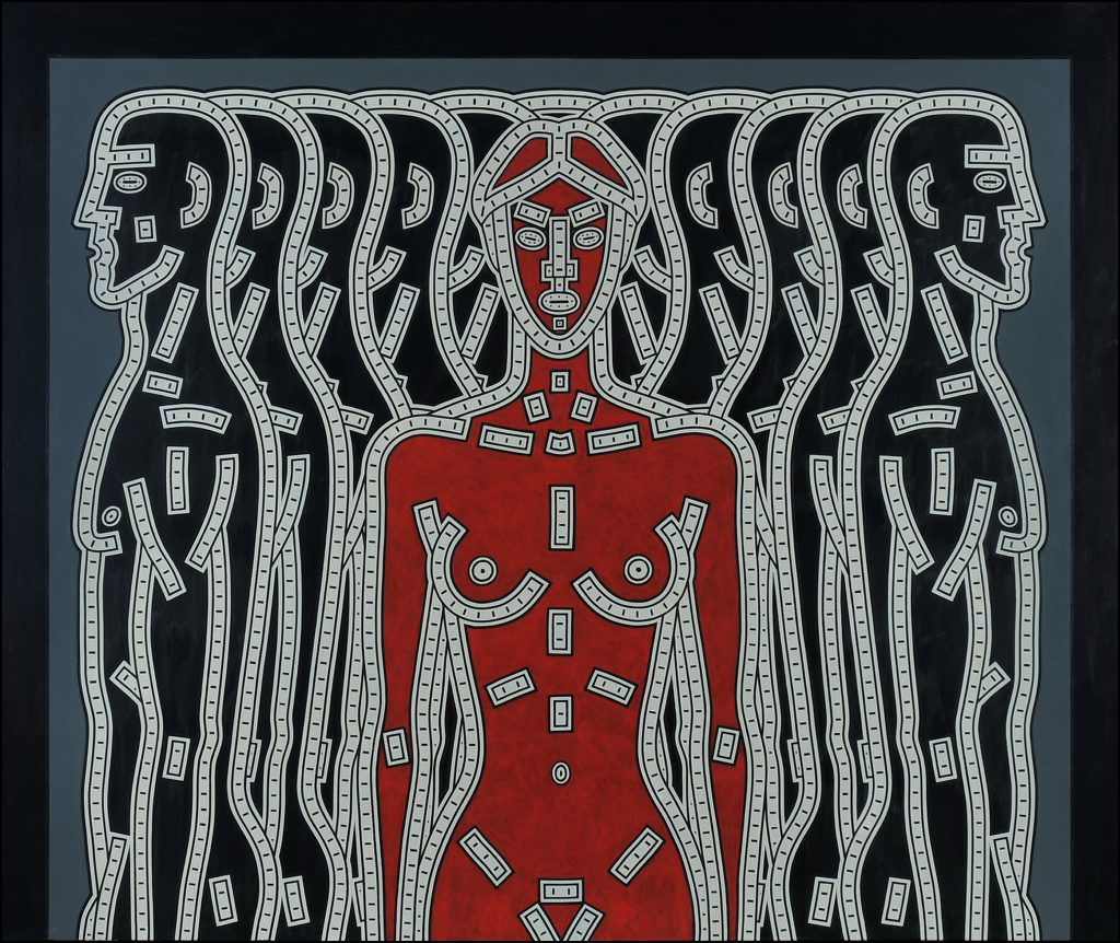 E’ qui che si sviluppa l’attuale percorso artistico caratterizzato da una doppia linea nera che conchiude barrette perpendicolari e dà corpo a figure stilizzate che rendono il suo lavoro immediatamente riconoscibile. Il nero domina, la ripetitività del segno riempie la tela. L’artista è capace di manipolare tecniche e materiali in modo diretto ed incisivo. Nulla è lasciato al caso perché ogni minima mossa è studiata come in un gioco di scacchi.