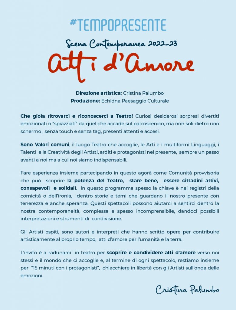 inaugurano " #TEMPOPRESENTE scena contemporanea 2022 / 23 Atti d’Amore "