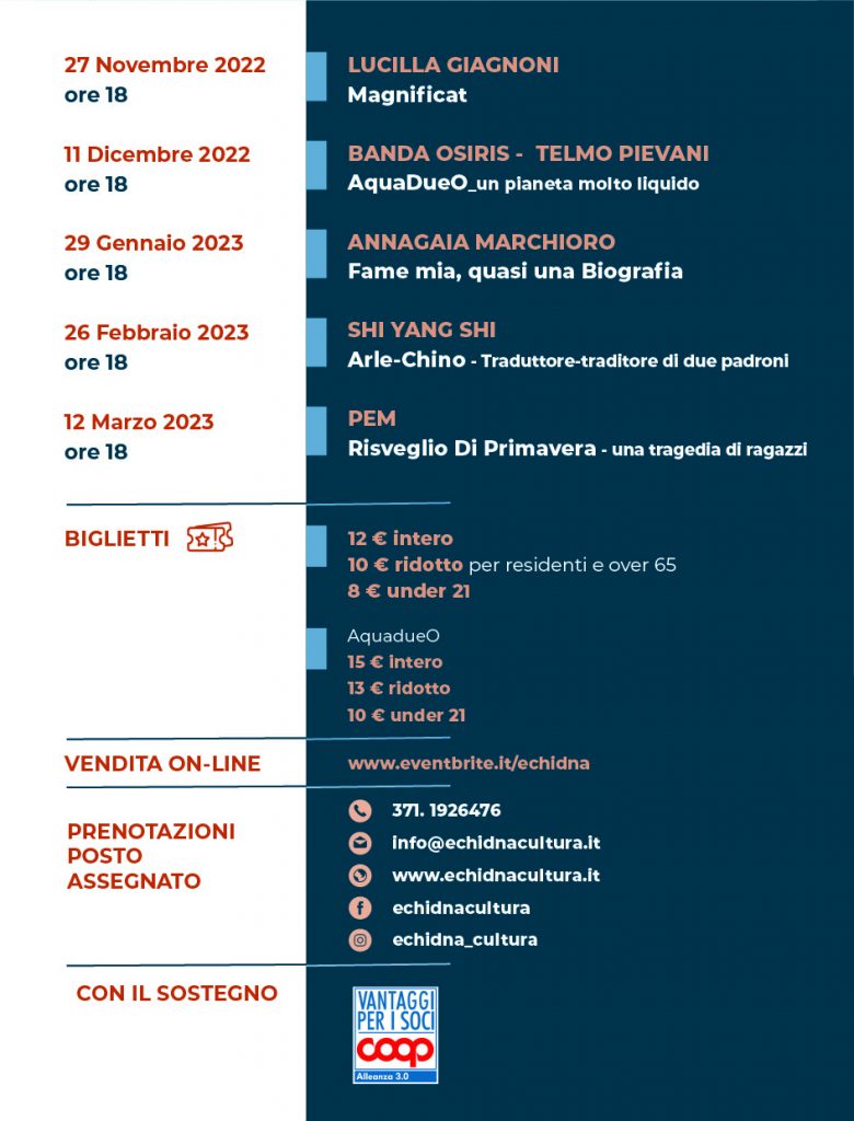 il programma teatrale da novembre a marzo, domenica 27 NOVEMBRE 2022,ore 18 con un’inno alla Vita, alla Terra e al Teatro, una preghiera di LUCILLA GIAGNONI che, forse, porta una risposta: