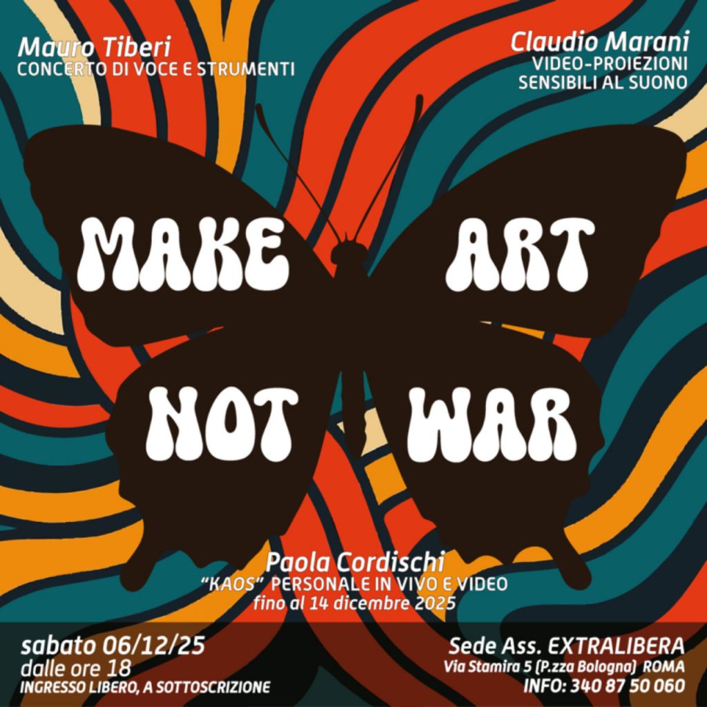 In un tempo in cui la guerra — militare, economica, psicologica e mediatica — torna a condizionare il mondo, MAKE ART NOT WAR afferma che fare arte non è un gesto neutro, ma un atto di posizionamento e resistenza. La mostra riunisce tre artisti — Claudio Marani, Mauro Tiberi, Paola Cordischi — che attraverso linguaggi differenti costruiscono un dispositivo estetico e politico fondato sull’ascolto, sull’attenzione e sull’interrogazione critica.