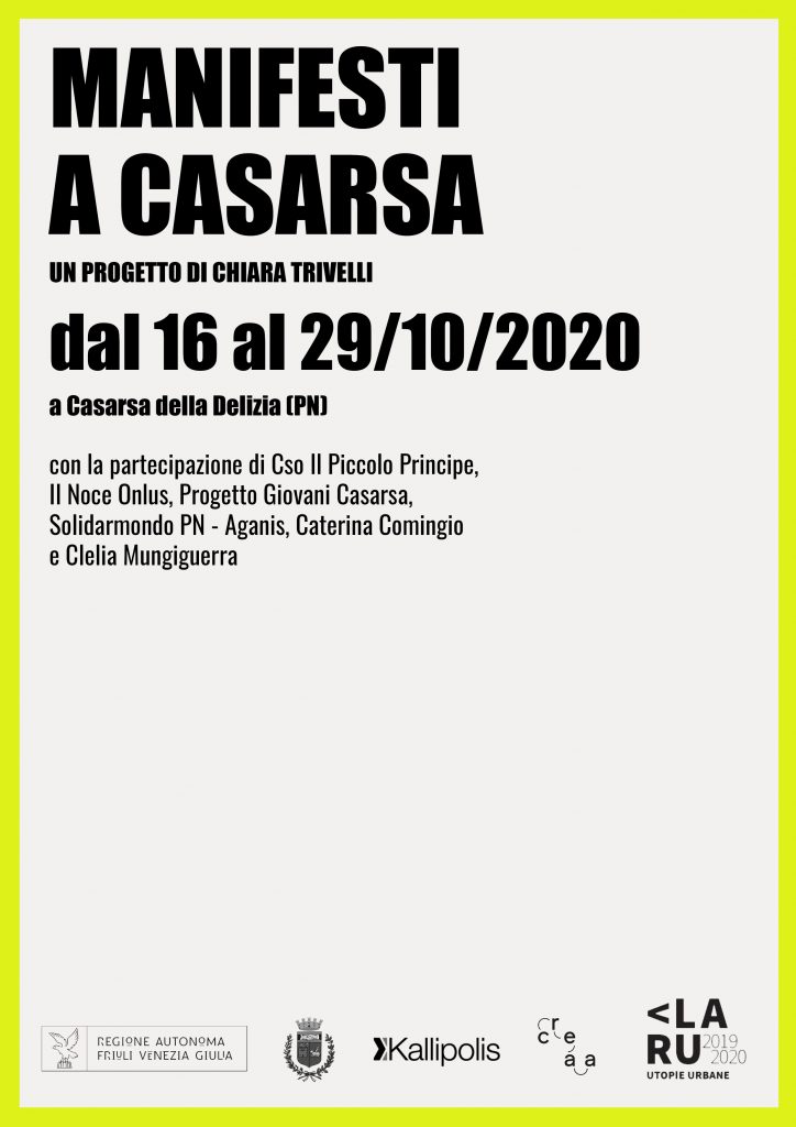 "Manifesti a Casarsa" è un progetto dell’artista Chiara Trivelli, nato all’interno del programma LARU - LAboratorio di Rigenerazione Urbana, quest’anno alla sua quarta edizione. Il programma, promosso e coordinato da Associazione Kallipolis, in collaborazione con Creaa Snc e cofinanziato dalla Regione Friuli Venezia Giulia, ha previsto la selezione di sei artisti per l’ideazione e conduzione di un laboratorio sul tema della rigenerazione urbana in altrettante località del Friuli Venezia Giulia.