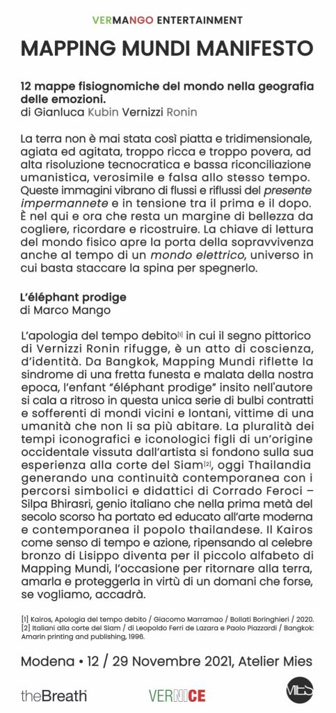 Mapping mundi è un manifesto di intenti e intenzioni che attraverso i percorsi visivi di Vernizzi indica una critica e riflessione sull’andamento del nostro pianeta malato.