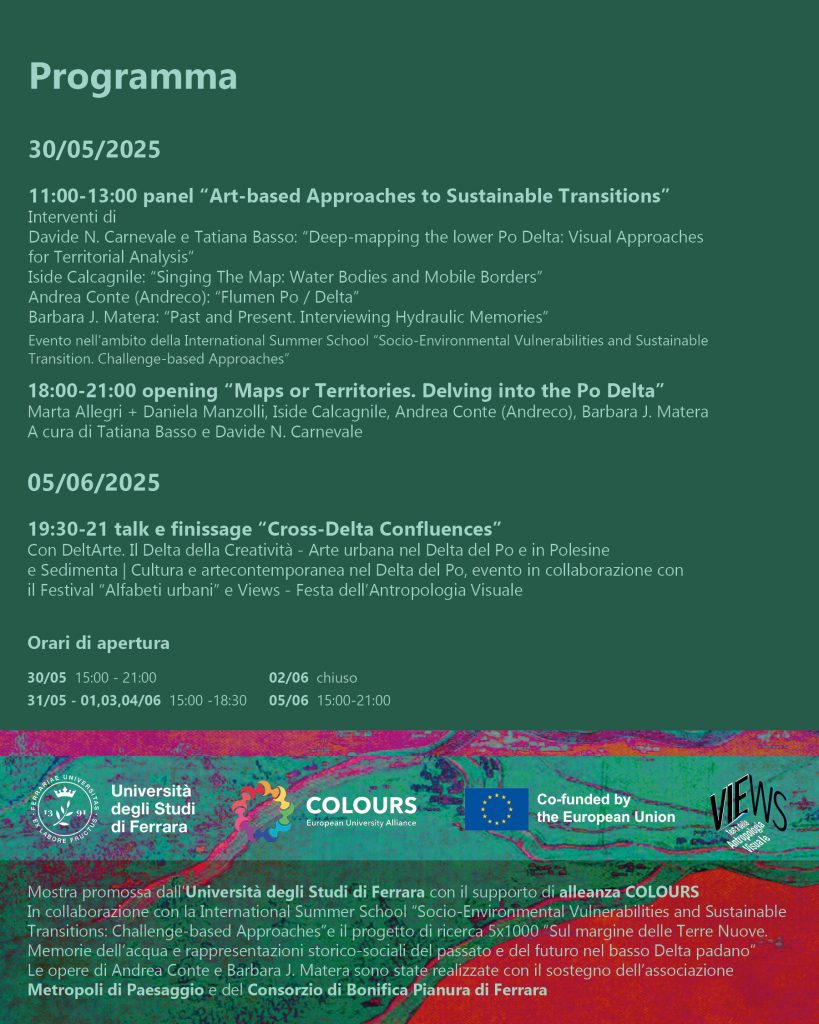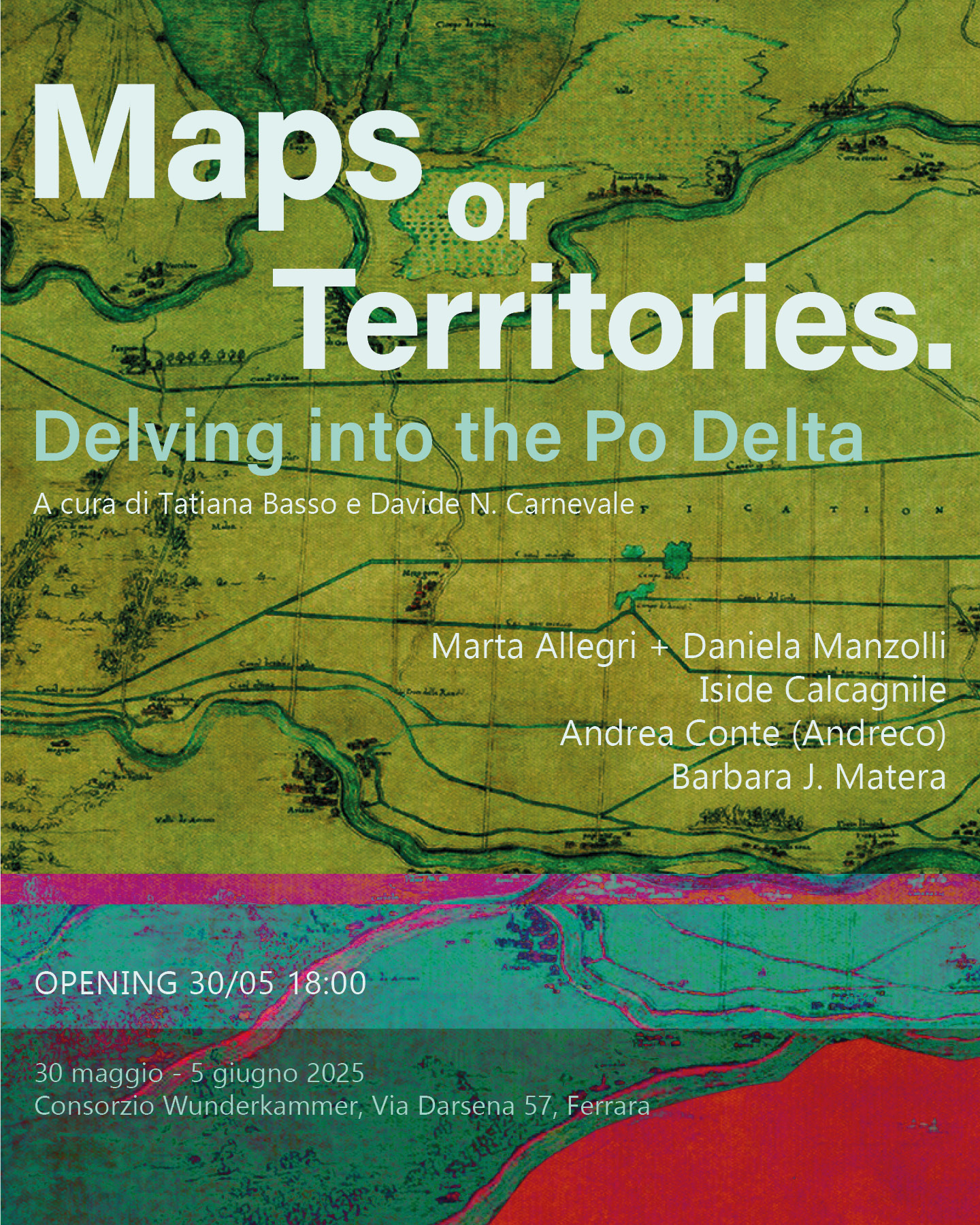 La mostra "Maps or Territories. Delving into the Po Delta" raccoglie gli interventi di cinque artiste e artisti che hanno sviluppato percorsi di ricerca dedicati al basso Delta padano, un territorio indagato ricorrendo a materiali d’archivio, osservazioni ambientali, interviste e cartografie. Come ramo del progetto di ricerca del Dipartimento di Studi Umanistici dell’Università di Ferrara "Sul margine delle Terre Nuove" l’esposizione a cura di Tatiana Basso e Davide N. Carnevale propone una “mappatura profonda” di un territorio spesso appiattito su descrizioni epistemologicamente povere, che tendono a non riflettere la complessità delle trasformazioni storiche, dei fenomeni ambientali e dei processi socio-territoriali che hanno modulato e continuano a riconfigurare l’ambiente deltizio. Sono riflessioni, quelle nate da questo percorso, che prendono in larga parte il via dalla relazione fondativa tra il territorio e le sue acque, che ne ridisegna senza posa i tratti. Su di essa s’improntano la storia, gli scenari attuali e le prospettive di luoghi soggetti a continue riconfigurazioni, nel loro insieme riconducibili al precario equilibrio idrico che di queste terre ridisegna senza posa i tratti, influenzando l’habitat naturale, la quotidianità delle persone, il funzionamento delle infrastrutture e delle economie locali, le sue possibilità di futuro.