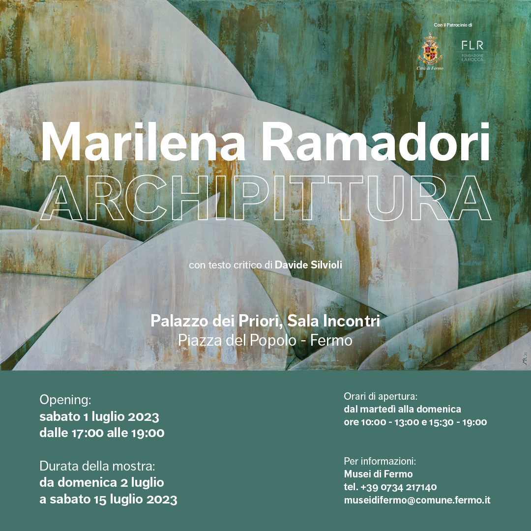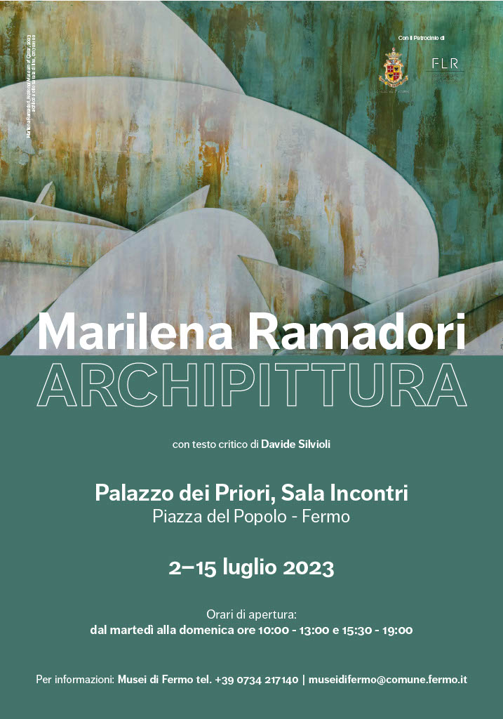Archipittura è il titolo della mostra personale di Marilena Ramadori (Montegiorgio, Fermo, 1965) ospitata presso il trecentesco Palazzo dei Priori della città di Fermo e aperta al pubblico dal 2 al 15 luglio 2023. La titolazione del progetto riprende un termine coniato dallo storico artista Osvaldo Licini, sottendendo un modesto omaggio alla sua figura. Il nucleo dell’esposizione corrisponde a due recenti cicli di dipinti, costituendo un’occasione per confrontarsi con gli esiti più prossimi della ricerca dell’artista. Si tratta di una serie di lavori concentrata su grandi opere d’architettura della città di Roma e di un’altra dedicata a prestigiose sedi museali internazionali.