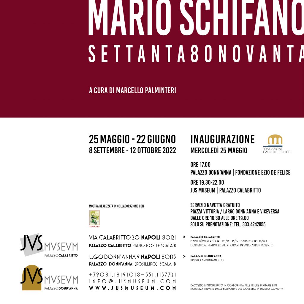 Mercoledì 25 giugno dalle 17.00 alle 22.00 (nelle due sedi di JUS MUSEUM: Palazzo Calabritto e Palazzo Donn'Anna) si inaugura la mostra “MARIO SCHIFANO. SETTANTA80NOVANTA”, a cura di Marcello Palminteri. In esposizione, venti opere realizzate da Mario Schifano tra gli anni Settanta e gli anni Novanta, provenienti da collezioni private.