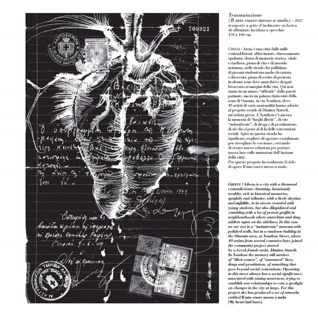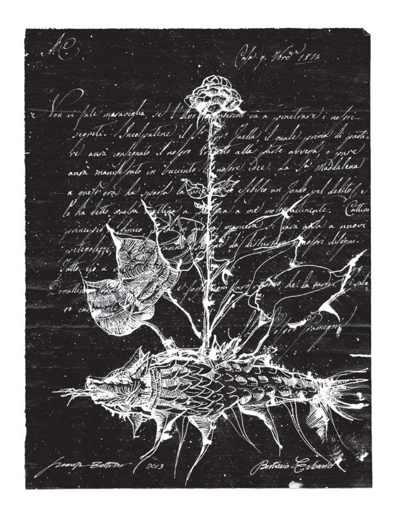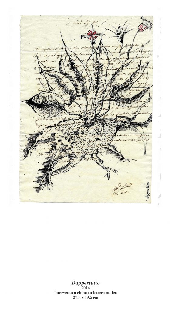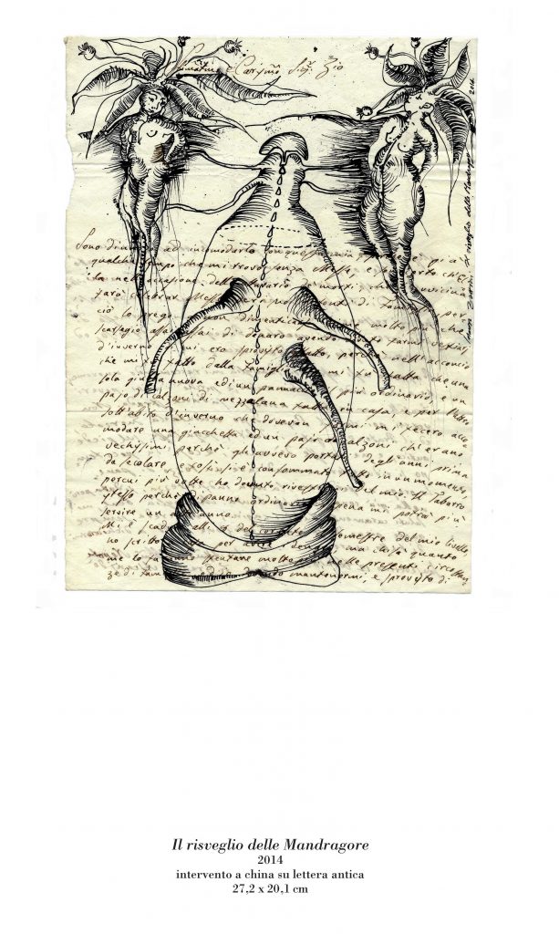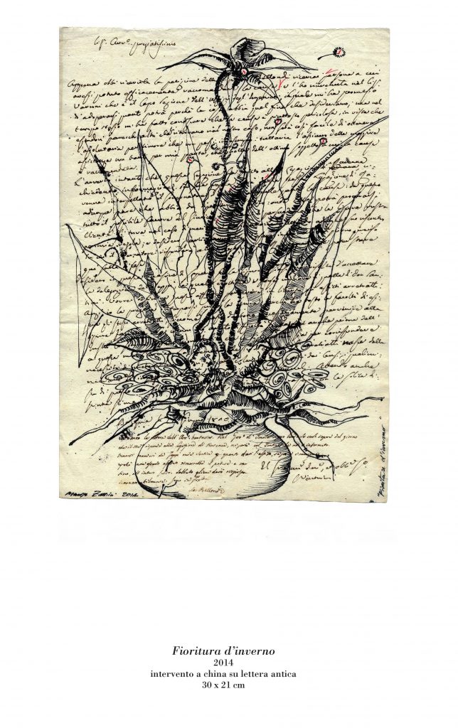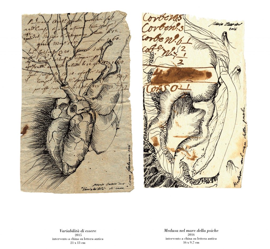 “Anatomie notturne” è un racconto delle metamorfosi e delle trasformazioni che la vita, in un mondo silente e misterioso, opera nelle varie dimensioni del cosmo. In questa mostra Marisa Zattini presenta una serie di lavori realizzati in varie tecniche e supporti (lastre di alluminio lucidate a specchio, fogli in pvc, interventi a china su lettere antiche e tanto altro). L’artista stessa è un’alchimista, una maga, una scienziata che prende appunti su fogli antichi disegnando insetti, bachi, creature normalmente quasi invisibili, per dar loro vita e per riportarle alla vista di noi esseri umani.