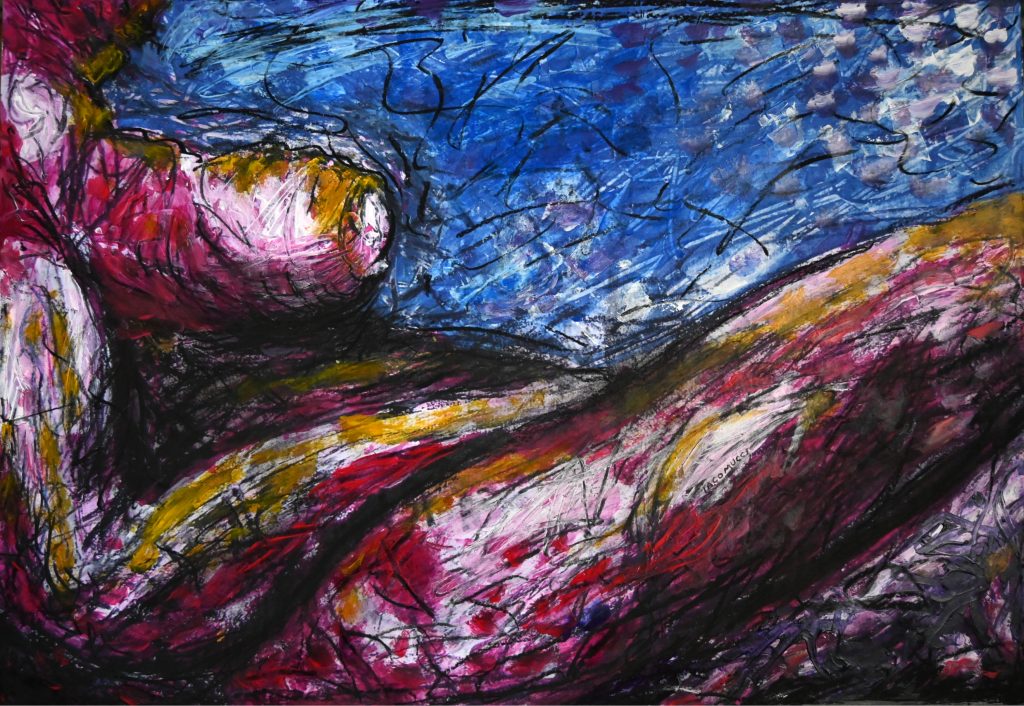 La visione pittorica di Focanti è l’apertura a un mondo onirico in cui il dato fenomenico si fonde con quello simbolico. L’approssimarsi delle forme e dei colori alla riconoscibilità della natura fa da contrasto ad elementi spuri che appaiono e sostano nella tela: in particolare il volto diventa sineddoche del corpo, una parte per il tutto, un profilo radicato nello spazio che lo circonda in una metamorfosi panteistica dell’umano.