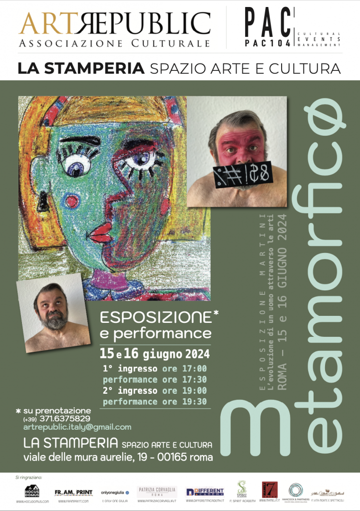 Giancarlo Martini, artista poliedrico noto attore , si appresta ad esporre le sue opere in una mostra intitolata "Metamorficø". L'evento, organizzato da PAC104 Cultural Events Management in collaborazione con la curatrice Paola Proietti, si svolgerà presso La Stamperia Spazio Arte e Cultura nei giorni 15 e 16 Giugno.