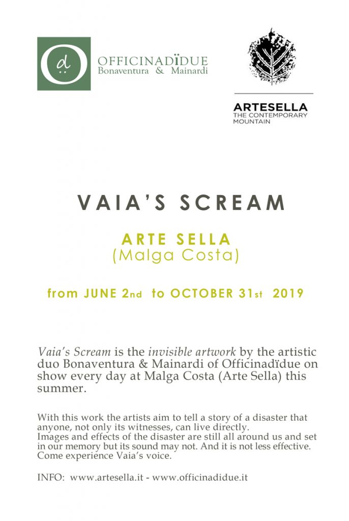 L'installazione sonora "Urlo di Vaia" di OfficinadÏdue è ospitata ad ArteSella, il museo di arte ambientale internazionale del Trentino. Si tratta di un'opera sonora, suggestiva e invisibile: non un'installazione nei boschi ma la voce dei boschi.