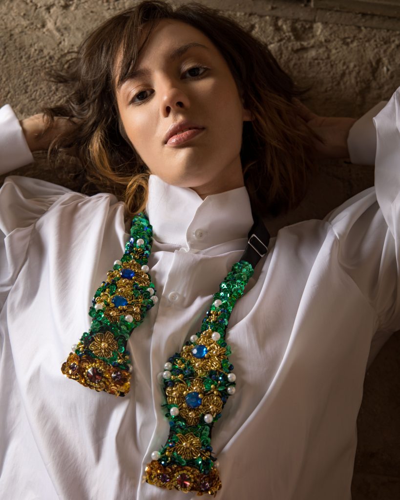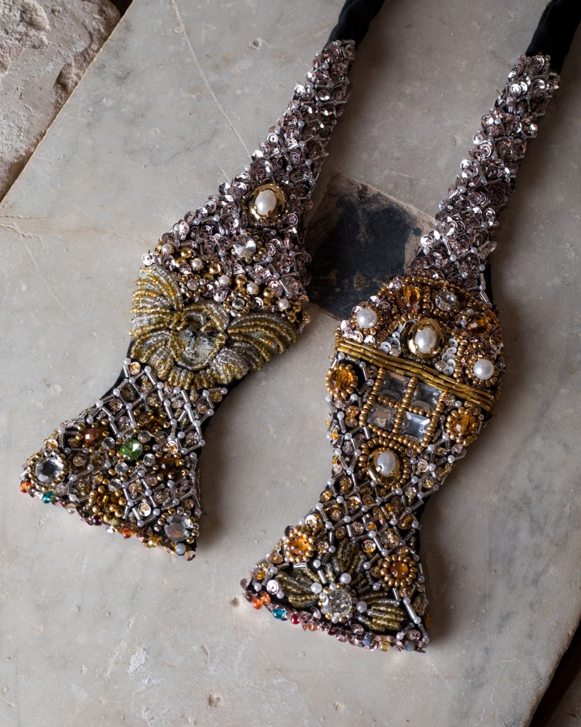 Il risultato sono sfavillanti papillon-icona interamente ricoperti da un tripudio di strass, pietre e perline in grado di dare vita a forme e bagliori di assoluto fascino.