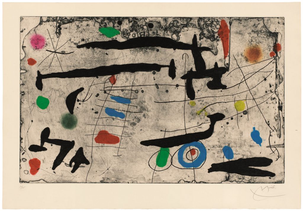 A collection of beautiful examples of Miró’s works on paper from 1931 to 1970. Paper was a medium in which Miró excelled. Here we see his skill with oil, watercolour, gouache, brush and ink, ink wash and wax crayon, and his adeptness at the use of mixed media on paper.