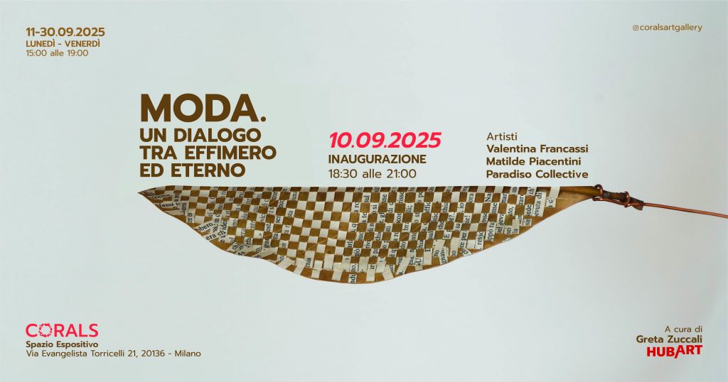 La moda è da sempre specchio dei tempi: riflette mutamenti sociali, desideri collettivi, tensioni culturali. Ma al cuore di questo fenomeno vibrante e in continua trasformazione si cela un paradosso affascinante: la sua intrinseca impermanenza. Ed è proprio questo aspetto – la bellezza effimera della moda – il fulcro della mostra “Moda. Un dialogo tra effimero ed eterno”, che inaugura mercoledì 10 settembre presso la Galleria Corals, con opere di Matilde Piacentini, Valentina Fracassi e Paradiso Collective.