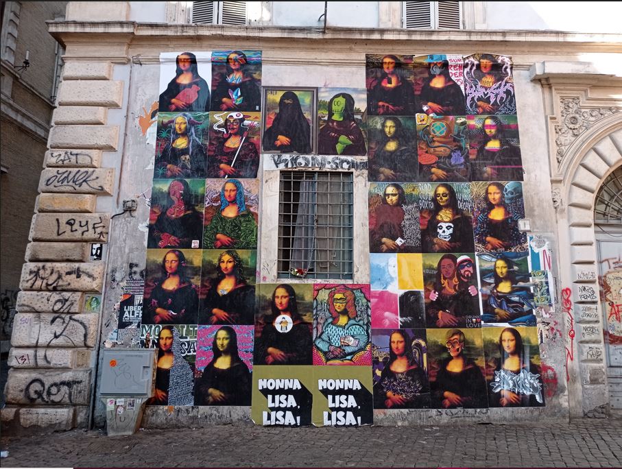 Da una settimana in uno degli angoli più famosi di Trastevere, piazza San Calisto, è comparsa una straordinaria composizione di ventinove Monna Lisa che sta attirando l’attenzione e gli sguardi dei numerosi passanti e turisti. Quello a cui assistiamo è un intervento di street art, realizzato in uno dei quartieri più significativi e rappresentativi della scena dell’arte urbana, che dona alla città di Roma e a tutti i cittadini la possibilità di ammirare lavori che altrimenti sarebbero stati relegati solo all’interno dei confini di una galleria. La parete è ricoperta da poster che riproducono le opere che sono state esposte nella mostra Monna Lisa, Lisa! ideata da Moro, tenutasi presso lo spazio espositivo di Up Urban Prospective Factory nel mese di gennaio.