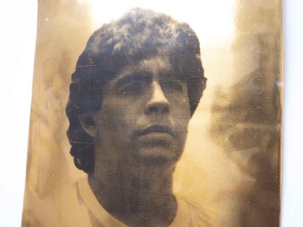 Il volto di Maradona si staglia su una superficie metallica dorata: una vera e propria icona sacra.