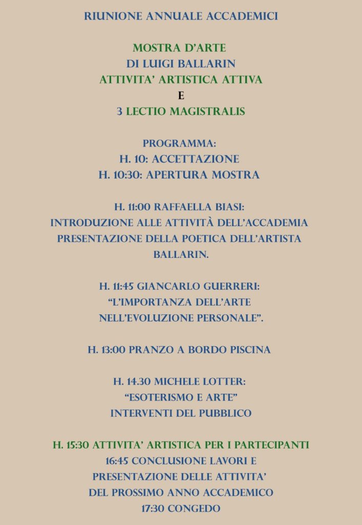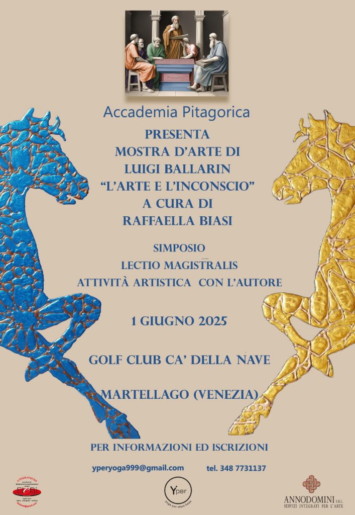 In occasione della riunione annuale dell’Accademia Pitagorica, ci sarà una intera giornata dedicata ad una mostra d’arte con le opere di Luigi Ballarin dal titolo “L’arte e l’Inconscio “, a cura di Raffaella Biasi, presidente dell’Accademia Pitagorica, un evento che comprenderà un Simposio , 3 conferenze ed 1 lavoro pratico insieme all’artista. Le Lectio Magistralis saranno tenute da due relatori illustri: Giancarlo Giovanni Guerreri che parlerà de “L’importanza dell’arte nell’evoluzione personale “e a seguire Michele Lotter con il titolo “Esoterismo ed Arte “.