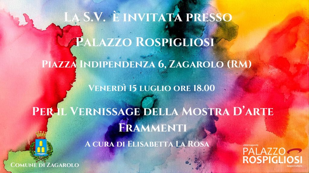 Dal 15 al 25 luglio nella cornice di Palazzo Rospigliosi di Zagarolo si animerà un viaggio nei meandri dell’essenza umana con le opere di 39 artisti partecipanti alla mostra d’arte contemporanea Frammenti, curata dalla Storica dell’arte Elisabetta La Rosa.