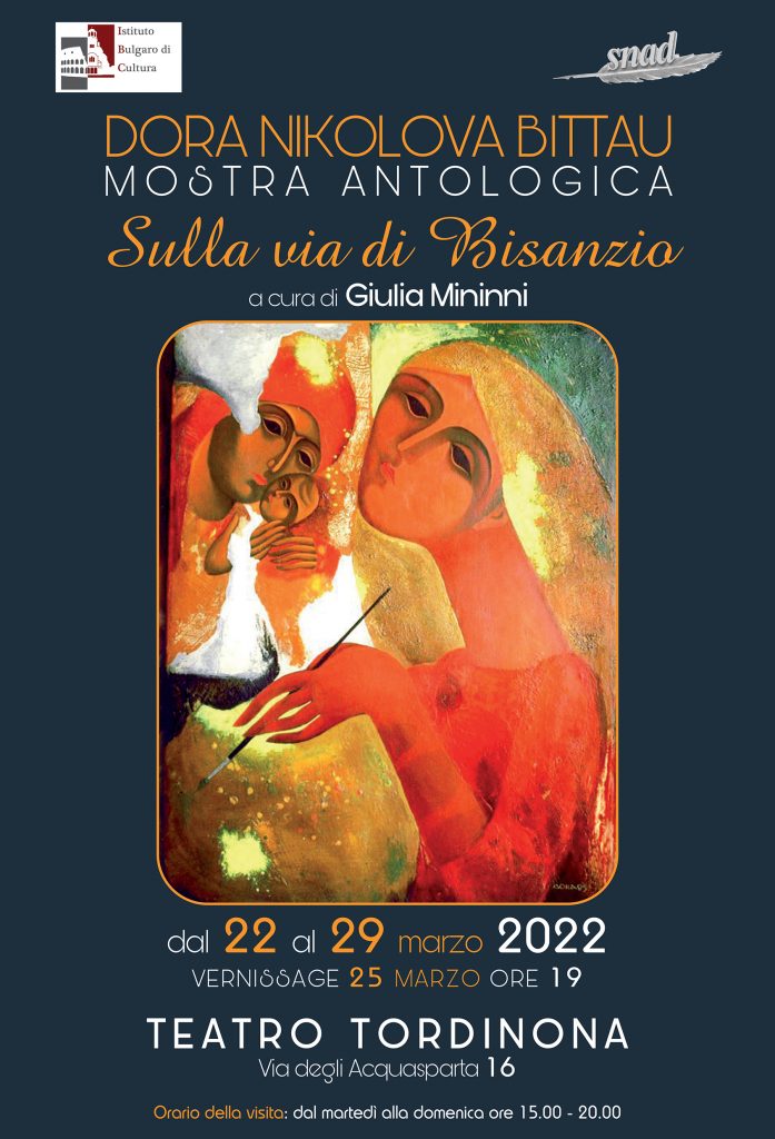 Dal 22 al 29 marzo, vernissage 25 marzo ore 19,00, presso il teatro Tordinona di Roma, l’artista Dora NiKolova Bittau presenterà un ciclo di opere “sulla via di Bisanzio”, dipinti dedicati ai Sovrani medievali bulgari, alla vita dei Santi Cirillo e Metodio, alle icone realizzate attraverso la sapiente tecnica bizantina.