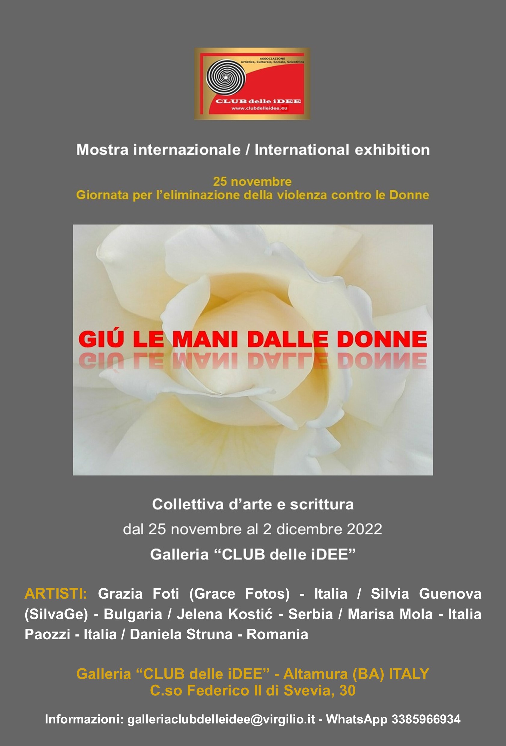 Da venerdì 25 novembre a venerdì 2 dicembre 2022 ad Altamura (BA) presso la Galleria “CLUB delle iDEE”, c.so Federico II di Svevia n. 30, mostra collettiva degli artisti Grazia Foti (Grace Fotos) - Italia, Silvia Guenova (SilvaGe) - Bulgaria, Jelena Kostić - Serbia, Marisa Mola - Italia, Paozzi - Italia, Daniela Struna - Romania.