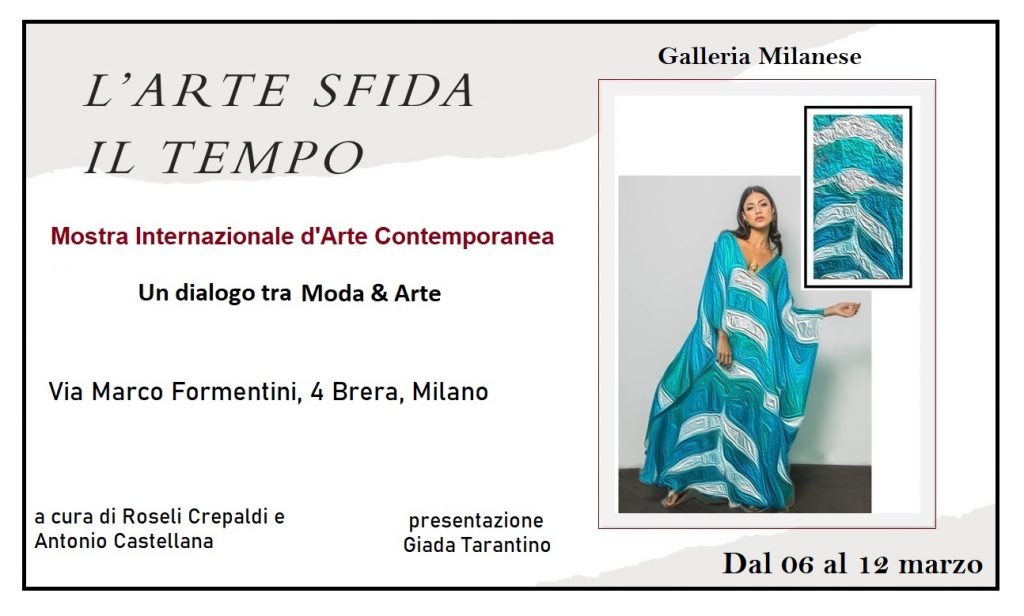 Laddove l'Arte sia Verità, Ideale, ragione di Vita, grembo ove rinascere sempre a se stessi: eterna, al di sopra di ogni parvenza. "L'ARTE SFIDA IL TEMPO", sarà Esposizione Internazionale d’Arte Contemporanea organizzata impeccabilmente da Galleria Milanese, curata dalla Dottoressa Roseli Crepaldi e dal Professor Antonio Castellana, e presentata da Giada Eva Elisa Tarantino, dal 6 al 12 Marzo 2023, in via Marco Formentin a Brera, in Milano, Italia.