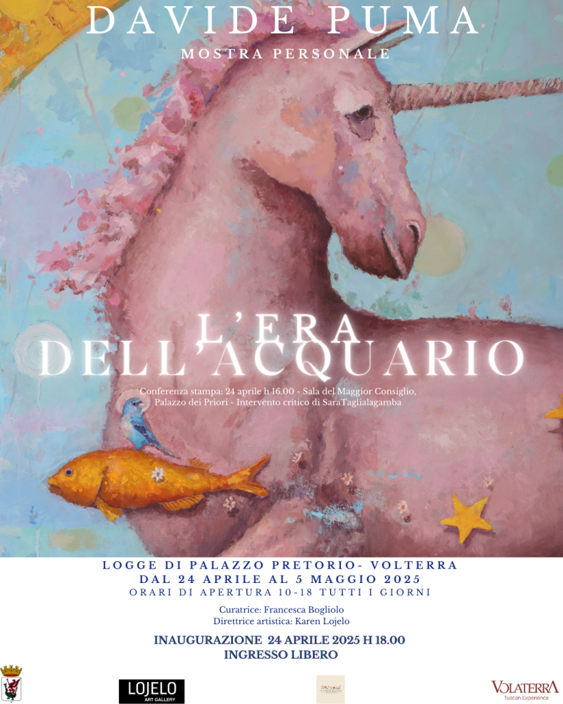 Siamo felici di annunciare che Lojelo Art Gallery – La Grande Bellezza Volterra ospita la nuova mostra personale dell’artista Davide Puma, intitolata “L’Era dell’Acquario”, che si terrà dal 24 aprile al 5 maggio 2025 nello spazio espositivo delle Logge di Palazzo Pretorio, nel cuore di Piazza dei Priori a Volterra.