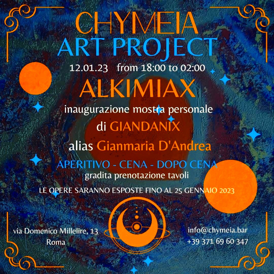 Il primo artista selezionato con la mostra di pittura dal titolo "ALKIMIAX" è il poliedrico artista GIANDANIX alias Gianmaria D'Andrea, che presenterà la sua ultima fatica creativa, una decina di dipinti della nuova serie "CHYMEIA" che prende proprio il nome del locale che ospiterà la mostra.