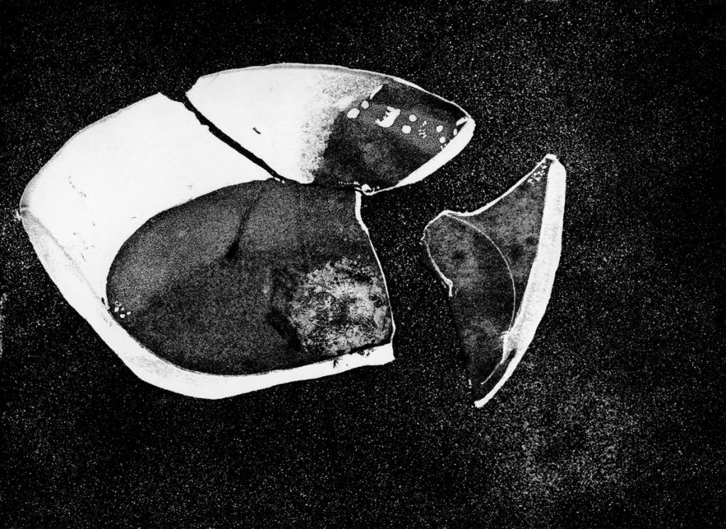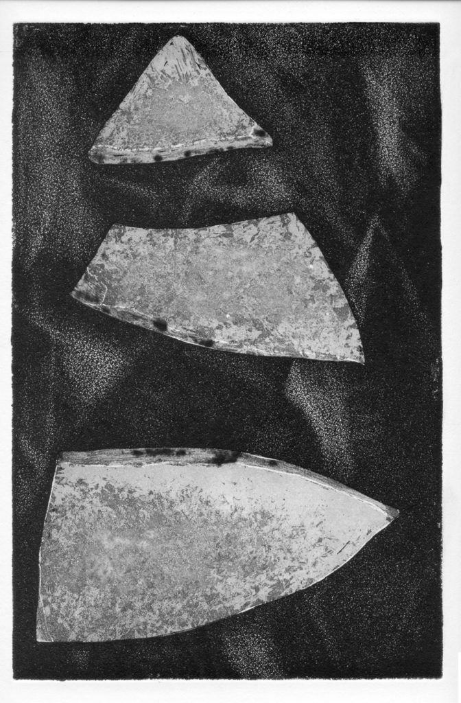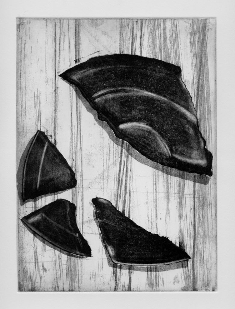Emanuela Casagrande tramite le sue incisioni realizzate in tecnica mista parla di un mondo la cui forza sta proprio nella fragilità. I piatti rotti, a volte solo sbeccati, a volte frantumati sono il pretesto per raccontare di fratture interiori, di cicatrici emotive e di frammenti esistenziali. In un tempo che predilige la perfezione qui viene evidenziato il difetto, come se la rottura di un oggetto non ne rappresentasse più la fine, ma un nuovo inizio. Le sue fratture diventano così soggetti di acqueforti e di acquetinte accentuate con la tecnica della puntasecca o impreziosite tramite la tecnica della ceramolle.
