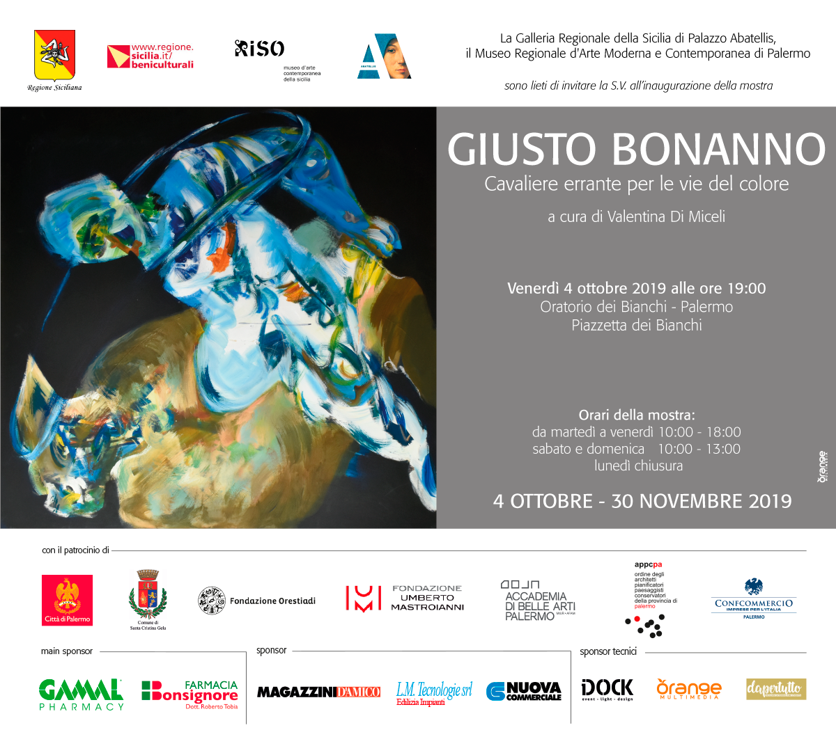 La Galleria Regionale della Sicilia di Palazzo Abatellis, il Museo Regionale d'Arte Moderna e Contemporanea di Palermo. Sono lieti di invitare la s.v. All'inaugurazione della mostra GIUSTO BONANNO "Cavaliere errante per le vie del colore" a cura di Valentina Di Miceli. Venerdì 4 Ottobre 2019 ore 19. Oratorio dei Bianchi, Piazzetta dei Bianchi. Palermo.