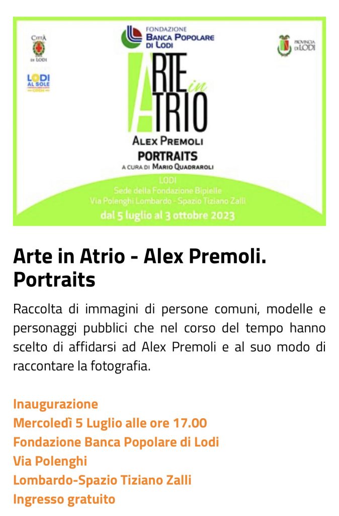 12 ritratti scattati dal fotografo lodigiano Alex Premoli classe 1984 saranno esposti presso lo spazio "Arte in Atrio" della Fondazione Banca Popolare di Lodi dal 5 Luglio al 3 Ottobre 2013.