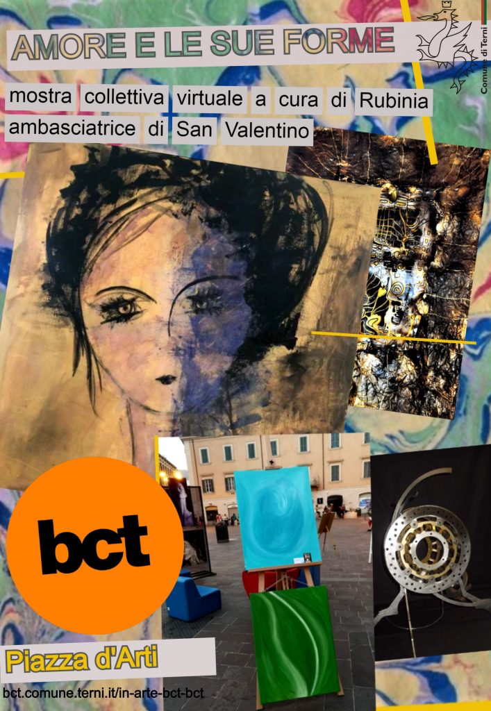 Con Rubinia, artista Ambasciatrice di San Valentino, la biblioteca comunale di Terni cura l'anteprima della mostra ospitandola sulla pagina tematica del proprio sito web In arte bct (https://bct.comune.terni.it/amore-e-le-sue-forme-0https://bct.comune.terni.it/amore-e-le-sue-forme-0 ) nell'ambito di Piazza d'Arti, progetto nato all'insegna della creatività e della poliedricità, tra arte e artigianato artistico, musica e poesia.