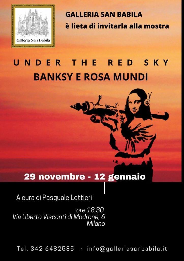 Solo all’apparenza distanti ma in fondo uniti dalla forza dirompente della loro critica sociale e politica, la visual artist Rosa Mundi e lo street artist Banksy presentano un comune denominatore da sempre: non hanno mai svelato la propria identità, lavorando così in totale anonimato, con il semplice intento di legare la propria produzione artistica non già ad un volto o ad un personaggio bensì alle singole opere che sono chiamate ad essere le uniche vere protagoniste e le effettive portavoci di messaggi universali come quello contro gli orrori delle guerre che è al centro della mostra “Under the Red Sky”.
