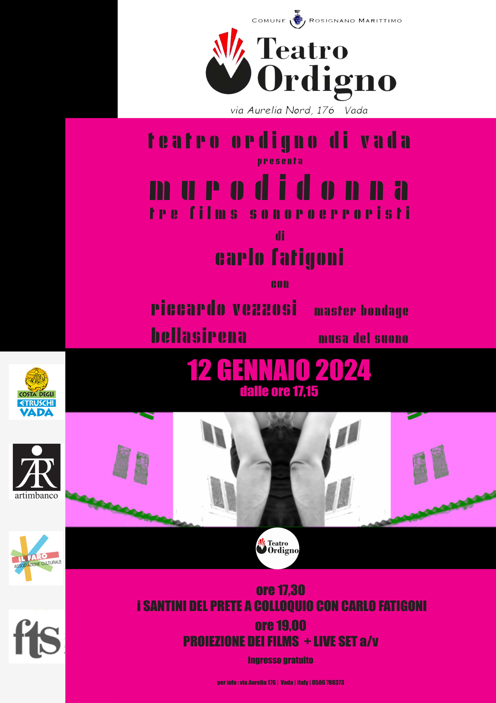 Il giorno 12 gennaio 2024 verranno presentati Tre Films sonoroerroristi di Carlo Fatigoni con Riccardo Vezzosi e Bellasirena - PROGRAMMA: alle 17,30 I Santini del Prete sul palco a colloquio con Carlo Fatigoni artista che incontra il pubblico e traccia il percorso della sua esperienza nel mondo dell’arte contemporanea sviluppatasi per oltre un trentennio - Screening films dalle 19,00 - Proiezione dei film di Carlo Fatigoni + live set audio|video.