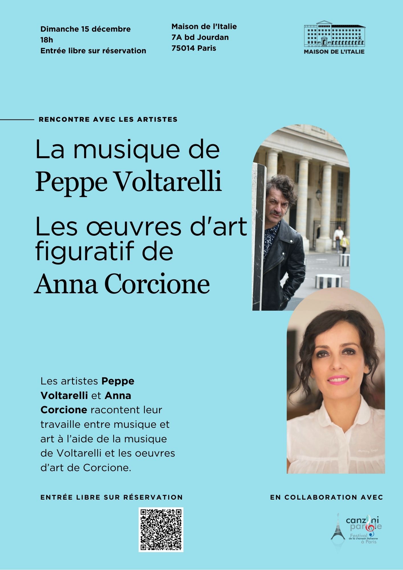 Domenica 15 dicembre 2024 alle ore 18:00, la Maison de l'Italie di Parigi ospiterà un evento speciale dedicato all’incontro tra arte e musica. Protagonisti del talk saranno Anna Corcione, pittrice e poetessa visiva napoletana, e Peppe Voltarelli, cantautore e artista poliedrico calabrese, fervente sostenitore e presentatore ufficiale del Festival “Canzoni & Parole” di Parigi.