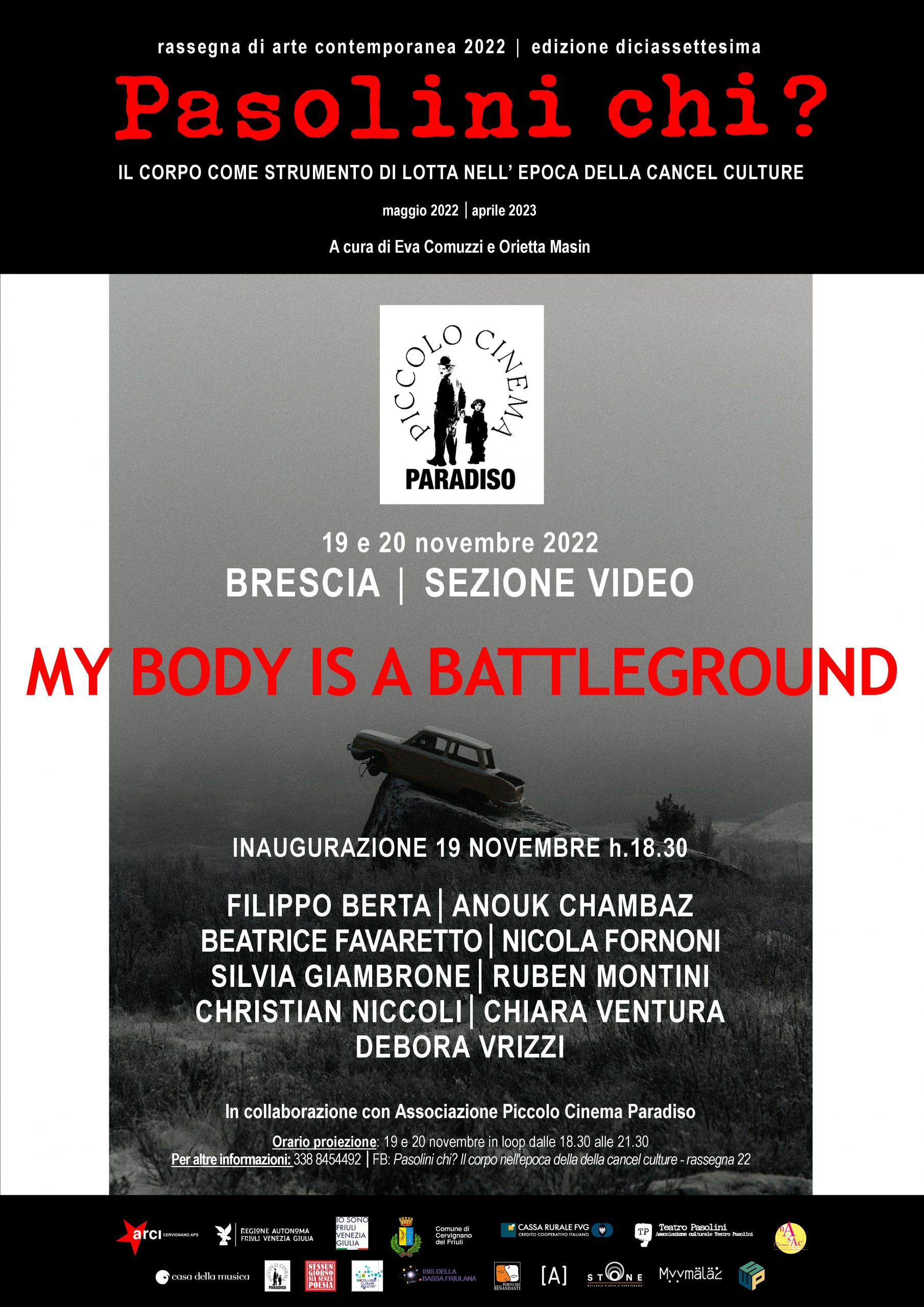 Mostra di arte contemporanea MY BODY IS A BATTLEGROUND - sezione videoarte: le opere di 9 artisti di livello internazionale, che nella loro pratica artistica utilizzano video e performance, saranno portate sullo schermo del Piccolo Cinema Paradiso, una delle due sale cinematografiche fondate da Silvano Agosti insieme al Cinema Azzurro Scipioni di Roma. La mostra si inserisce nella rassegna di arte contemporanea PASOLINI CHI? IL CORPO COME STRUMENTO DI LOTTA NELL’EPOCA DELLA CANCEL CULTURE.