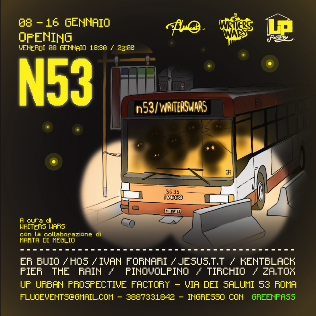 Sabato 8 gennaio Up Urban Prospective Factory è lieta di presentare “N53”, mostra collettiva a cura di Writers Wars con la collaborazione di Marta Di Meglio che si pone come obiettivo quello di indagare e rappresentare le diverse anime della notte romana. L’opening si svolgerà nella sede del progetto Up Urban Prospective Factory a Trastevere in Via dei Salumi 53.