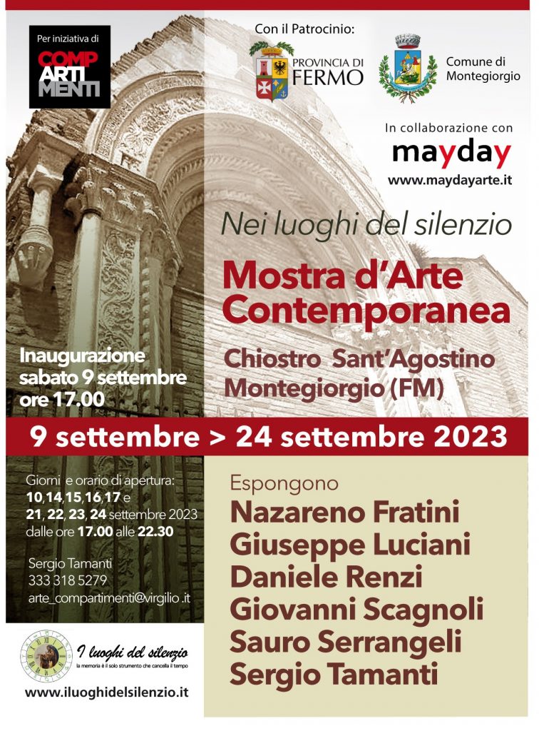 Si è inaugurata sabato 9 settembre 2023 a Montegiorgio (FM), Chiostro Sant’Agostino la mostra collettiva d’Arte Contemporanea dal titolo “ Nei luoghi del silenzio”. Una iniziativa di COMPARTIMENTI, gruppo di 6 artisti marchigiani, con il Patrocinio della Provincia di Ferno e del Comune di Montegiorgio in collaborazione con “maydayart.it” e “iluoghidelsilenzio.it”.