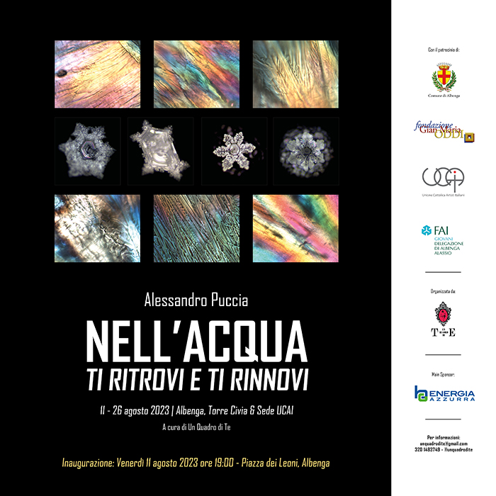 Dall’11 al 26 agosto 2023 ad Albenga si terrà la mostra fotografica “Nell'acqua ti ritrovi e ti rinnovi” dell’artista varesotto Alessandro Puccia a cura dell’associazione Un Quadro di Te in collaborazione con Giulia Pozzi.