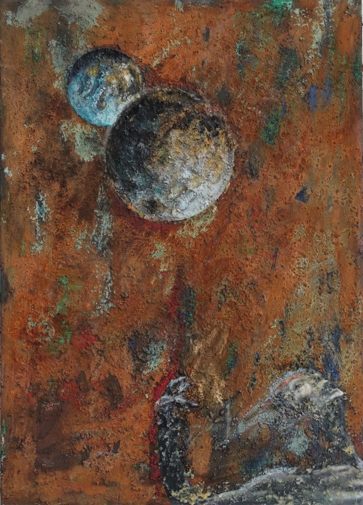 Barbara Nicoletto s’avventura negli spazi siderali, abitati da pianeti, da macchine volanti e da corpi che paiono avere perso ogni centro di gravità, con qualche animale fantastico che pare avervi fatto ritorno, dopo che se n’era immaginata una scomparsa che forse mai è avvenuta veramente, almeno oltre la nostra Terra; sontuosa è la materia pittorica cui l’artista fa ricorso, per rendere ancora più palpitanti e misteriosi i mondi evocati. Saranno esposte diverse opere dell’ultimo ciclo pittorico dedicato alle “lune”, opere che Nicoletto ha realizzato con una raffinata ricerca utilizzando materiali come sabbie e ossidi che le hanno permesso di realizzate superfici ossidate.