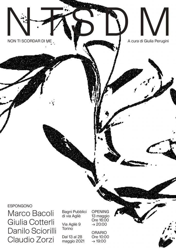 Apre al pubblico Non ti scordar di me, una mostra con opere di Marco Bacoli, Giulia Cotterli, Danilo Sciorilli e Claudio Zorzi, a cura di Giulia Perugini e con un progetto grafico di Gianluca Ciancaglini. Ospitata nei locali dei Bagni Pubblici di via Agliè, in via Agliè 9 a Torino, l’esposizione inaugurerà il 13 maggio 2021, alle ore 16:00.