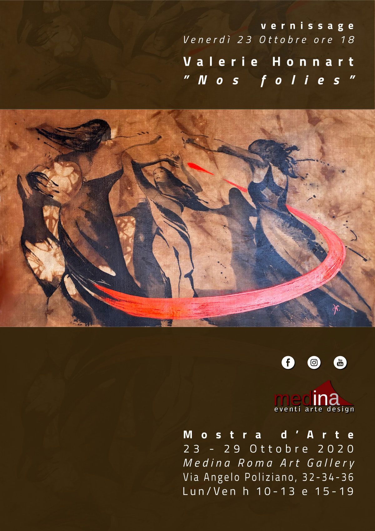 A seguito dell’online exhibit di Maggio 2020, la mostra fisica e personale Nos folies di Valérie Honnart dal 23 al 29 Ottobre 2020 presso l'Art Gallery Medina Roma. Con testo a cura di Lucia Collarile.