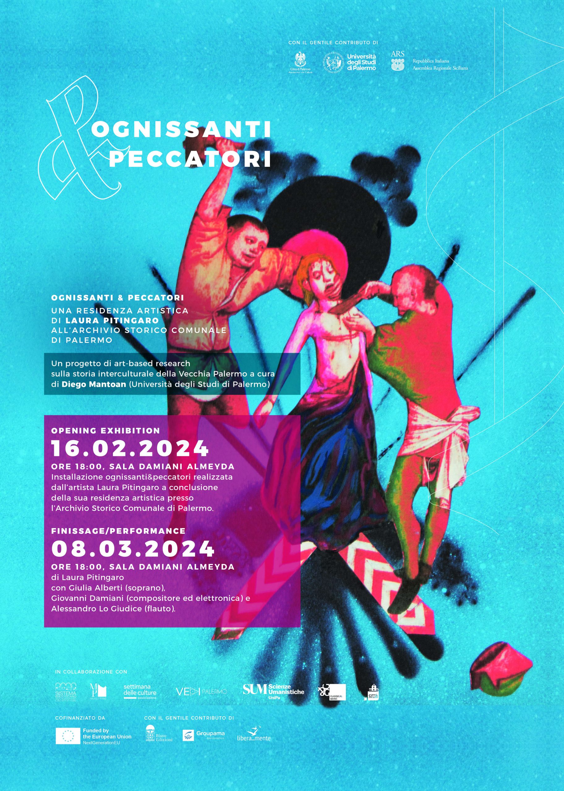 Dal 16 febbraio all’8 marzo 2024 nella monumentale cornice della Sala Damiani Almeyda sarà aperta al pubblico l’installazione ognissanti&peccatori realizzata dall’artista Laura Pitingaro a conclusione della sua residenza artistica presso l’Archivio Storico Comunale di Palermo. L’installazione è accompagnata da una mostra documentale ad opera dell’Archivio che presenta materiali legati a ricorrenze e processioni nella Palermo interculturale del Basso Medioevo, quando tra le mura della città convivevano cristiani, musulmani ed ebrei. Il progetto è impreziosito dal finissage con una performance pubblica prevista venerdì 8 marzo 2024, ore 18:00, ideata da Laura Pitingaro quale funzione sonora rievocativa assieme a Giulia Alberti (soprano), Giovanni Damiani (compositore ed elettronica) e Alessandro Lo Giudice (flauto).
