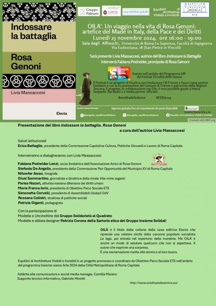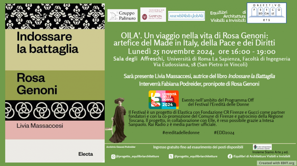 Incontro e presentazione del libro Indossare la battaglia. Rosa Genoni. L'evento è inserito all’interno del progetto Equilibri di Architetture visibili e invisibili un percorso collettivo di contaminazione e cooperazione tra realtà associative e professionistɘ.Il 25/11 è una data simbolo per donare in modo propositivo la possibilità di conoscere una donna straordinaria.L’incontro è aperto a tuttɘ coloro che desiderino abbracciare un’esperienza di conoscenza e confronto per la crescita della persona e l’arricchimento professionale.Il programma prevede un dialogo con l’autrice Livia Massaccesi,l’editore e varɘ ospitɘ