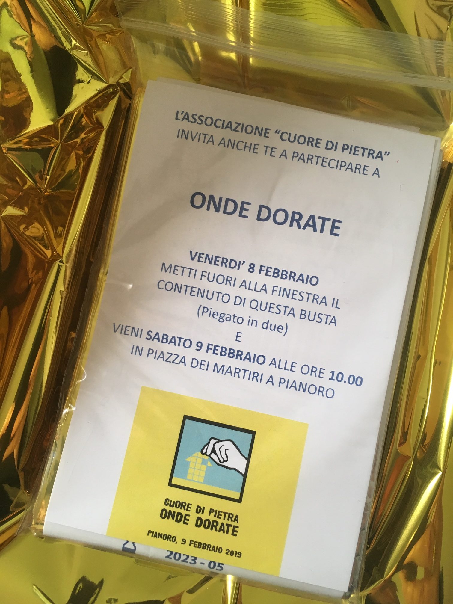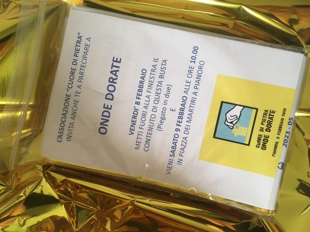 L'ideatrice dell'iniziativa, artista e curatrice a Pianoro del progetto partecipativo Cuore di pietra, spiega così il senso di questa proposta, immediatamente accolta dal sindaco e dalla giunta: “Solo un invito a contrastare la sovrabbondanza di parole, e di gesti ridondanti e opprimenti in tutti i campi: politica, luoghi di lavoro, cultura, arte. Silenzio! Chiunque, cittadino o istituzione pubblica o privata, potrà far eco a questo gesto procurandosi una coperta isotermica (si possono trovare in farmacia o nei negozi di parafarmaci) ed esponendola alla finestra come scudo dorato, protezione per chi ce l’ha fatta e arriva dal mare dopo indicibili violenze e sofferenze, ma anche per tutti noi, a difesa di quelle libertà, di quella umanità, che si rischia ci vengano progressivamente negate, onde che potranno propagarsi, come semplice gesto di scelta consapevole e come un inno silenzioso di potente poesia”.