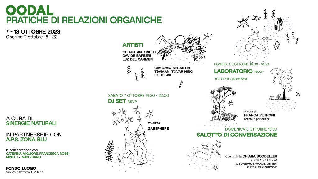 Mostra collettiva di Chiara Antonelli, Davide Barberi, Luz del Carmen, Tsamani Tovar Niño, Giacomo Segantin, Leilei Wu. Dalla parola Oodal che in lingua Tamili indica un amore nascosto dalla rabbia indicando la natura molteplice del sentimento che si prova verso l’ambiente che viviamo. Riflettendo sulle barriere fisiche e mentali che spesso separano il territorio naturale e lo spazio costruito, l’intento di Oodal è mettere in sinergia diverse sfaccettature di queste considerazioni sul territorio e lo spazio per superare i limiti culturali. A cura del collettivo Sinergie Naturali in partenership con l’A.p.s Zona Blu in collaborazione con Caterina Migliore, Francesca Rossi Minelli, Nan Zhang.