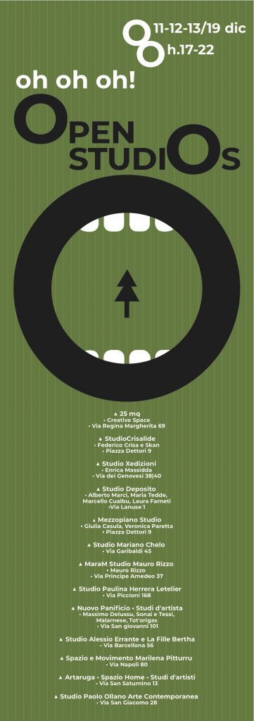 Dall'11 al 13 dicembre, Cagliari ospiterà la prima edizione di Open Studios, progetto indipendente e autofinanziato, che invita a visitare oltre dieci spazi di produzione dell'arte attivi in città, e si concentra nei quartieri della Marina, di Villanova e di Castello.