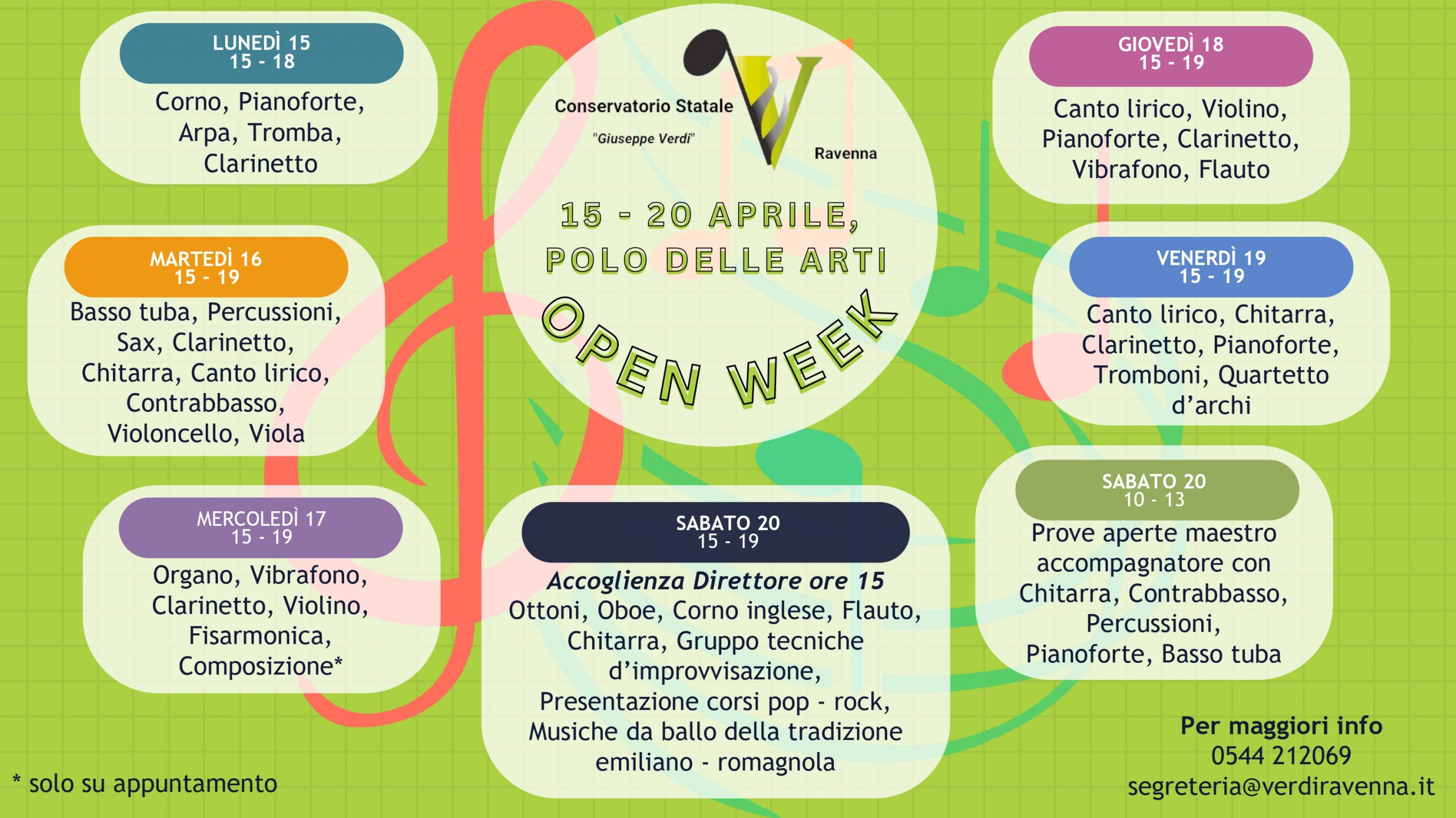 Il Conservatorio Statale "Giuseppe Verdi" di Ravenna è lieto di annunciare la sua Open Week, un'opportunità per esplorare gli spazi e scoprire le varie possibilità che iscriversi in conservatorio comporta. L'Open Week si svolgerà presso il Polo delle Arti, situato in Piazza J.F. Kennedy 7, ogni giorno dal 15 al 19 aprile, nel pomeriggio dalle 15:00 alle 19:00. Inoltre, sabato 20 aprile, sono previsti due turni: la mattina, dalle 9:00 alle 13:00, e il pomeriggio, dalle 15:00 alle 19:00, iniziando con una cerimonia di benvenuto presieduta dal direttore.